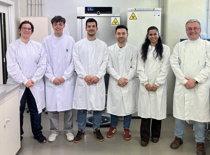 (Imágenes: 1.- Blanca Lorente Torres, Sergio Fernández Martínez, Jesús Llano Verdeja, Pablo Castañera Estrada, Helena Á. Ferrero y Michal Letek Polberg; 2.- Gráfico explicativo del proceso seguido; 3.- Trabajo realizado en los laboratorios de la Universidad de León; 4.- Células humanas infectadas con S. aureus.)